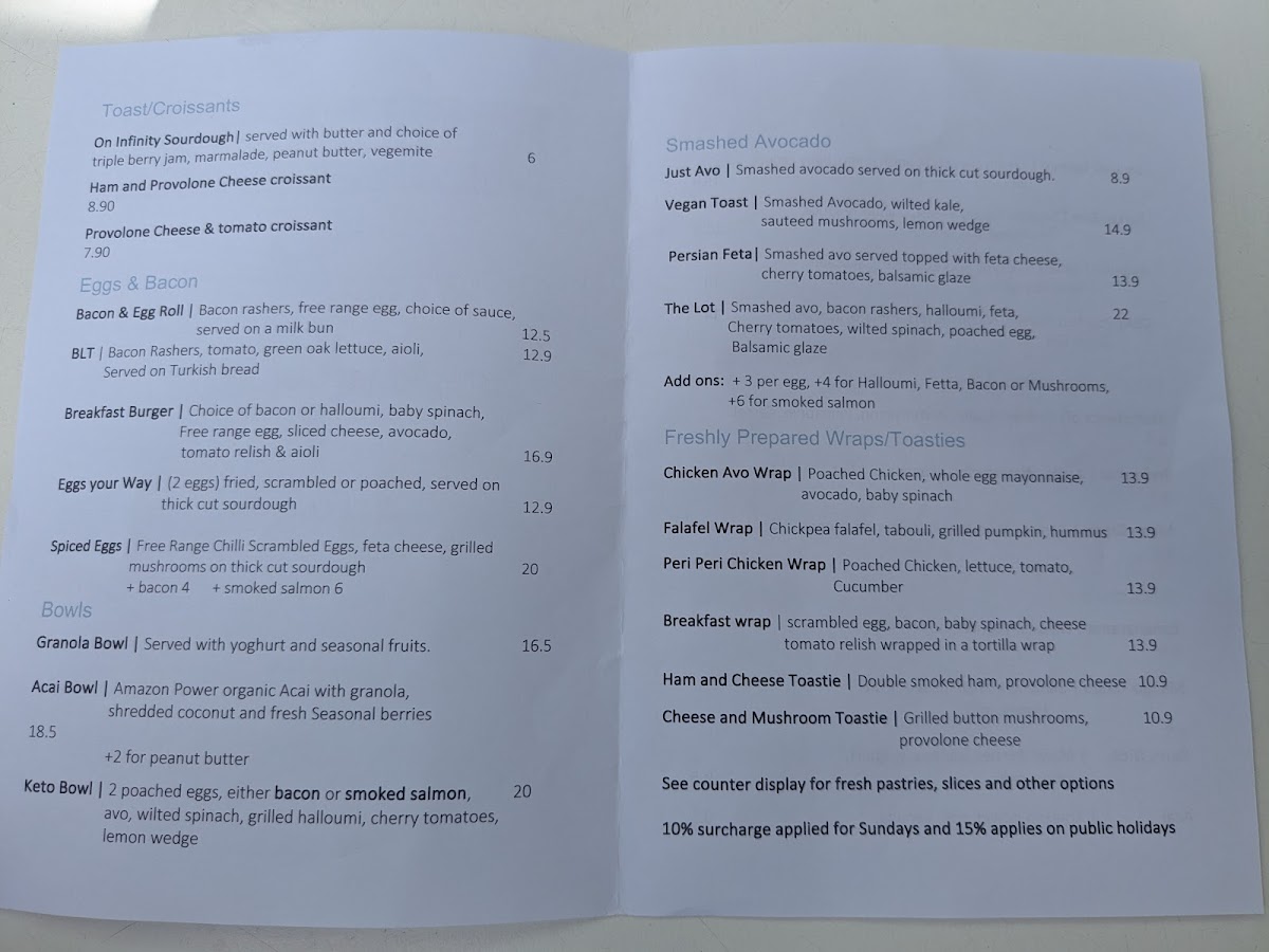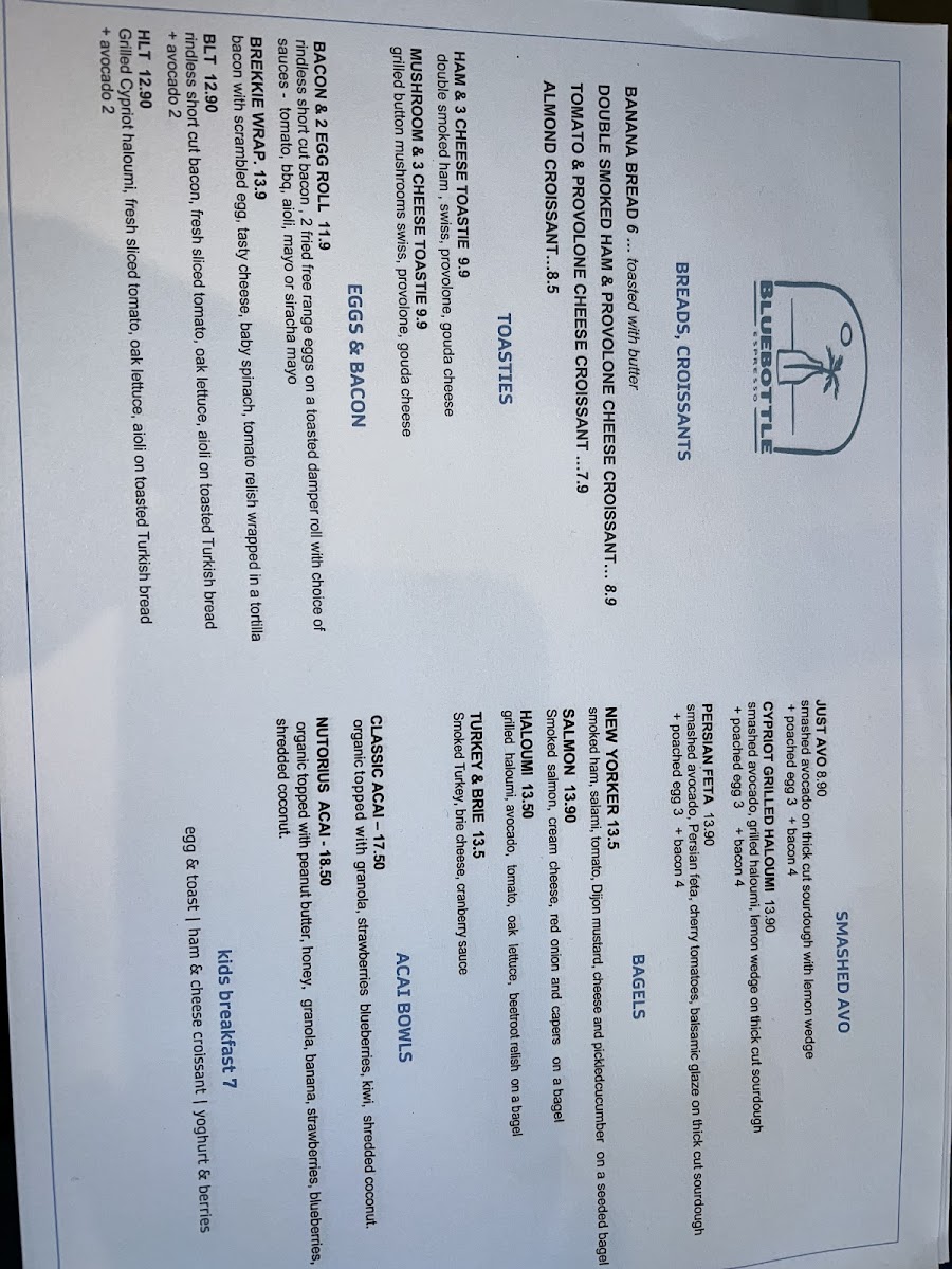 Bluebottle Espresso in Manly offers a delightful menu perfect for breakfast, lunch, and everything in between. For breakfast, they serve hearty options such as the Persian feta and Bacon and egg roll or the indulgent Breakfast burger. If you're looking for something lighter, the Spiced eggs are a flavorful choice. Their freshly squeezed juices add a refreshing touch to any meal. Moving to lunch, the menu includes satisfying wraps and bagels like the Salmon Bagel and Turkey bagel, alongside the mouthwatering Italian job or the nutritious Chicken avocado wrap. For those craving a vegetarian option, the Falafel wrap is a fantastic choice. To pair with any dish, they offer a variety of drinks, including classic Coffee, Tea, and Prana chai, or the refreshing Cold brew and smooth Fast filter. With such a diverse menu, Bluebottle Espresso delivers both flavor and quality in every bite and sip.